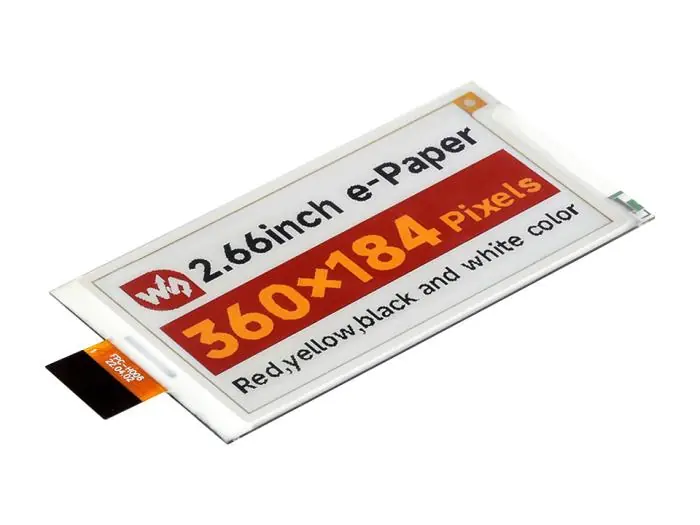 Displaymodul E-papper / E-ink med 360×184 px upplösning. Kan visa fyra färger: svart, vit, röd och gul. Kommunicerar via SPI.