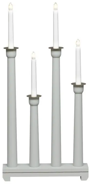 Konstsmide 3977-310 är en är en elljusstake med 4 ljuspunkter, av trä i grå med mässingsdekoration 230V/IP20.