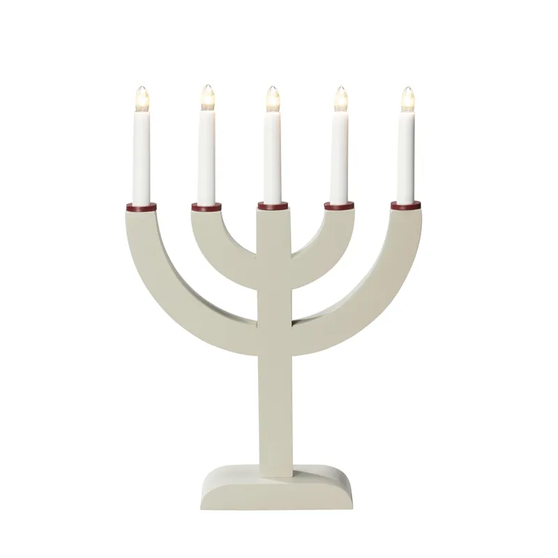 Konstsmide 3936-957 är en är en elljusstake med 5 ljuspunkter, av trä i beige/mörkröda dekoration, 230V/IP20.