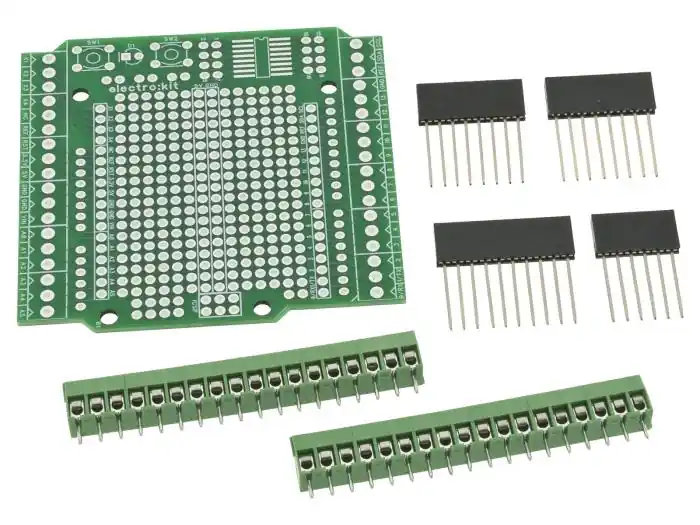 Anslutningskort för Arduino UNO och kompatibla modeller. Kortet bryter ut alla IOs från UNO till skruvplintar för enkel anslutning. Ledningsbanorna mellan skruvplintar och UNO går att bryta på undersidan av kortet om man inte vill ha en direkt anslutning. I mitten av kortet finns plats för egna uppkopplingar med en mängd oanslutna lödanslutningar, 2.54mm rastermått. Plats på kortet finns även för två enkla tryckknappar, en lysdiod samt en ytmonterad krets i SOIC-format (upp till 16-pin). Kortet levereras med skruvplintar och stackningsbara hylslister.