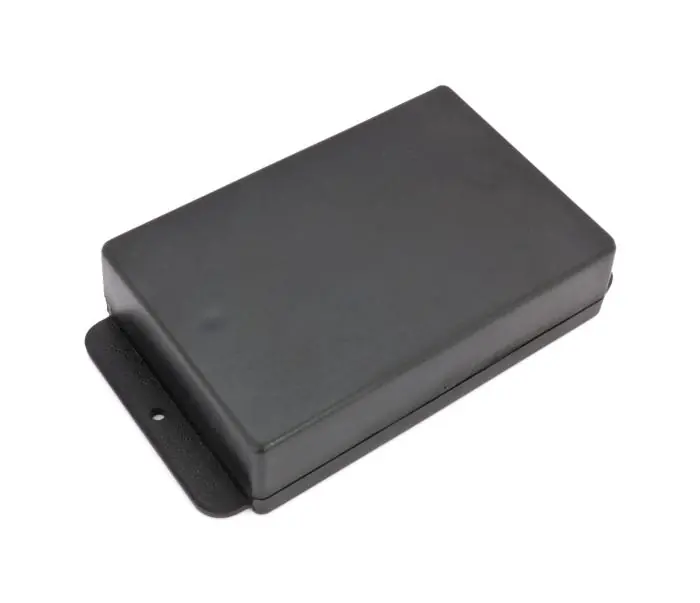 Apparatlåda i svart plast med flänsar.