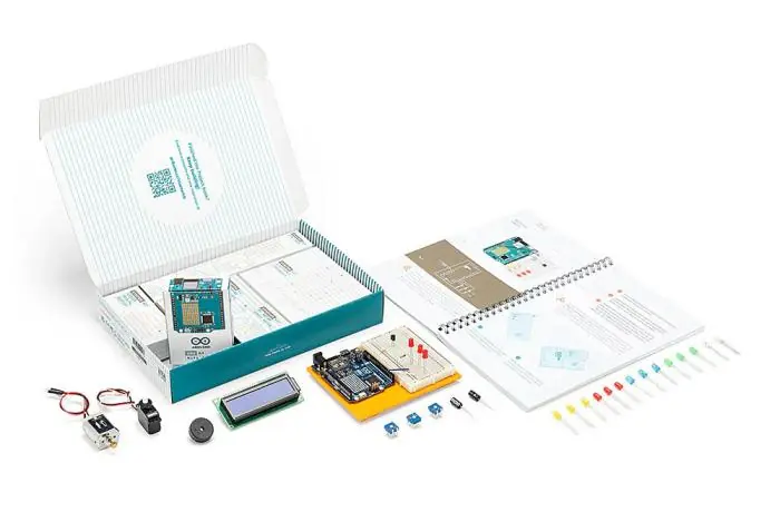 Förpackningen innehåller en tryckt projektbok med 13 steg-för-steg-projekt som leder användaren genom komponenter och kretsar. Vid registrering online får användaren tillgång till ytterligare digitala resurser: fler experiment samt en GenAI-kodassistent för online-editorn.