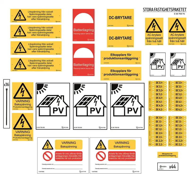 Märk-kit anpassat för uppmärkning av en solcellsanläggning i större fastighet. Detta kit ger dig både trygghet och förståelse när du monterar ditt solcellssystem så du aldrig behöver vara osäker. Det underlättar även om andra ska ta hand om systemet.