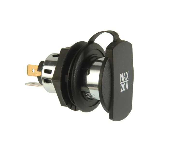 12-24V cigarettuttag (21 mm) med motmutter och skyddslock. För inbyggnad i bil, båt och husvagn etc. Max belastning: 20 A (kabelarea 2.5 mm²) eller 15 A (kabelarea 1.5 mm²). Ansluts med 6.3 mm flatstifthylsa eller lödning. Fabrikat: Pro Car. Tysktillverkad. TÜV-certifierad.