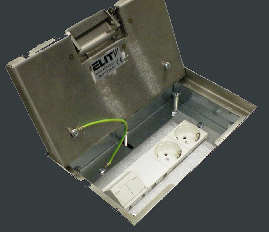 Elit 1174736 är en golvbox med fläns i rostfritt stål för HDF bjälklag. Golvboxen är lämplig till offentliga miljöer som bilhallar, gallerior, utställningar, utbildningslokaler, m.m. i kraftig och hållbar konstruktion. Locket är tillverkat i 4 mm plåt och tål mycket hög belastning. Lock i rostfritt stål, 20 mm djupt för golvmaterial typ trä, sten, marmor. Ram med krage, 10 mm bred täcker håltagningen i golvet. Underdelen tillverkad i galvaniserad stål, djup 120 mm. Hål för anslutningsrör i gavlar 4xØ25 & 1xØ50 mm.