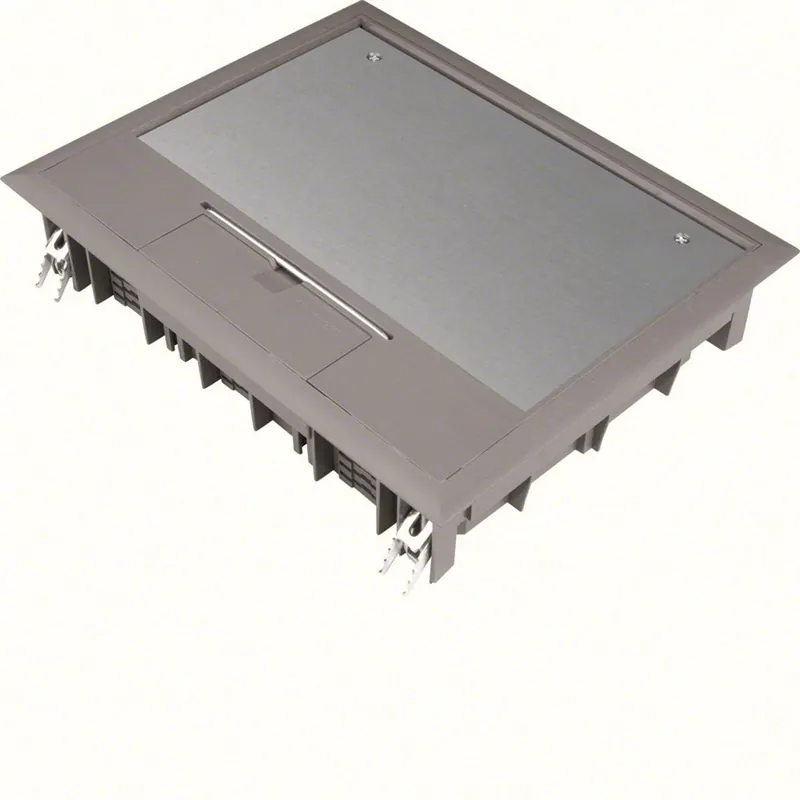 Hager VE09057011 är en grå golvbox för upp till 9 installationsapparater i 3 apparatdosor GTVR300, GBVR300, GTVD200. Apparatboxar stegvis sänkbara till 18 mm. Med kabelutgång i locket. Yttermått: 219×272 mm. Inbyggnadsmått: 200×253 mm.