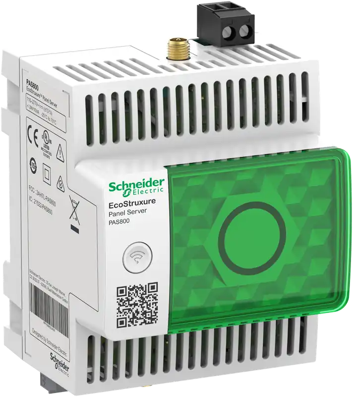 Schneider Electric PAS800 EcoStruxure Panel Server är en datalogger och tillika gateway som tillhandahåller anslutning av trådbundna eller trådlösa smarta IoT-enheter till programvara för edge control eller molntjänster. Tre års dataloggning med användarvänliga webbsidor som erbjuder energitabell, trendanalys av mätserier och visning av registrerade larm. Enkel felsökning av systemet genom inbyggda webbsidor med avancerad diagnostisk information och loggar. Enkel driftsättning genom inbyggda webbsidor eller med EcoStruxure Power Commissioninng som ger driftsättningsrapporter med avancerade funktioner.