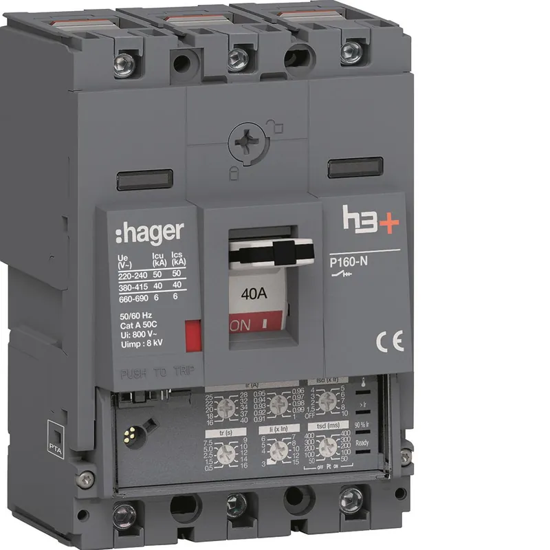 Effektbrytarna h3 + (MCCB) från Hager har brytförmåga upp 50 kA vilket ökar säkerheten utan att kompromissa med driftsäkerheten. Förutom termomagnetiska utlösningsskydd erbjuder h3+ även elektroniska skydd i form av LSI och Energy. Med Energy versionen erhålls fler mät och styrfunktioner såsom energimätning, effekt, ström och spänning.