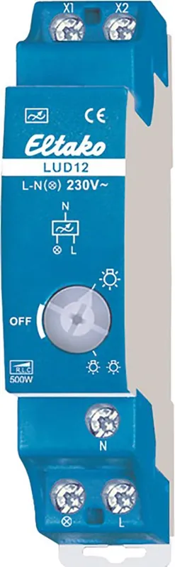 Utgång MOSFET 400W. Endast 0,1 watt effektförbrukning i standby-läge. Modulär enhet för skenmontering enligt DIN-EN 60715 TH35. 1 modul = bredd 18mm, djup 58mm. OBS kontaktorer för att öka brytnings effekten skall inte anslutas i serie till denna typ av apparat. Effektutökaren LUD12-230V kan kopplas till EUD12Z, EUD12D och SUD12/1-10V. Detta medför en ökning i brytförmågan på en ledning med upp till 400, 350 eller 300W enligt schema nedan, beroende på ventilationsförhållandena. Alternativt med flera belysningsledare upp till 400W/effektutökare. Endast med extra ljus för lågenergilampor (ESL) eftersom 100W per ljus inte får överskridas. Båda brytnings funktionerna kan utföras samtidigt för utökad effekt. Automatisk avkänning av lasten ”Effektutökning på flera belysnings ledningar”. Manöverspänning 230V. Automatiskt elektroniskt överlast- och temperaturskydd. Vid ”effektutökning med fler belysningsledare” kan den typ av last som kopplas in på effektutökaren LUD12-230V skilja sig från den tryckdimmern styr. Det är på detta sätt möjligt att blanda L- och C-laster. Produkten kräver nolla