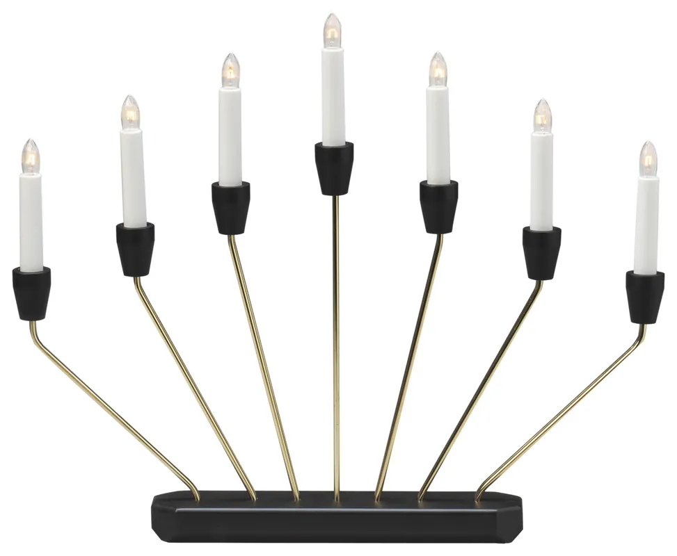 Konstsmide 3539-870TR är en elljusstake med 7 ljus, förmässingad med svart fot. 24V/IP20.