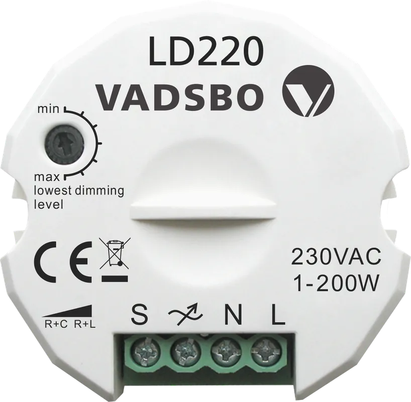 Universaltryckdimmer i liten dosformat för inbyggnads montering i vägg eller i apparatdosa. Speciellt anpassad för dimring av lågenergi- och LED-lampor. Fungerar även utmärkt vid dimring av LED-driftsdon och glödljus.