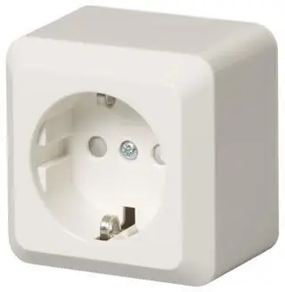 Kompletta vägguttag för utanpåliggande montage, IP 20. Alpinvit. Av slagtålig halogenfri polykarbonat. Snabbanslutning av ledarna om ej annat anges. Hel bottenplatta16A, 250V.