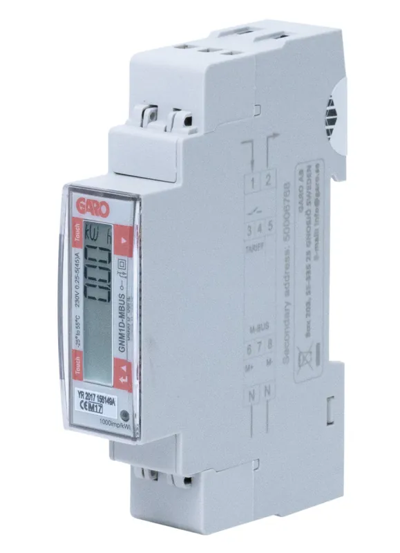 Garo 108045 är en kompakt energimätare som mäter upp till 45 A och har M-busutgång för återgivning av energiförbrukning. Avläsning av förbrukning är enkel att göra på den skarpa LCD-skärmen.