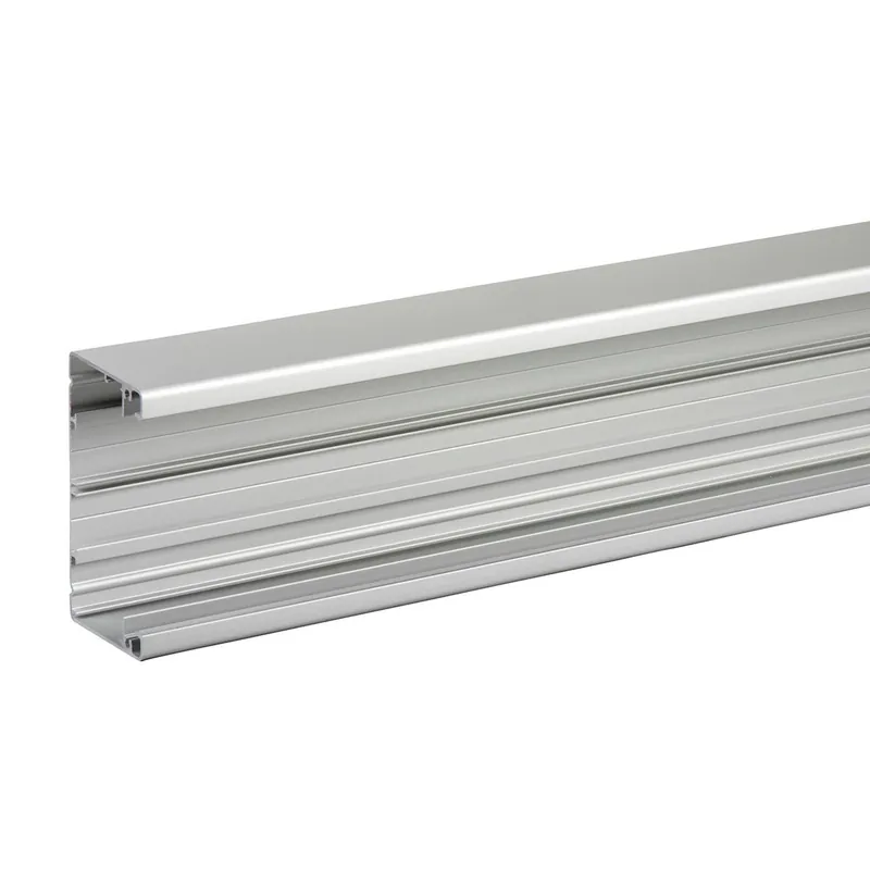 Tillverkad av aluminium med 80 mm frontöppning. Kan delas i 3-fack med kabelhylla. Försedd med skruvspår och jordspår.