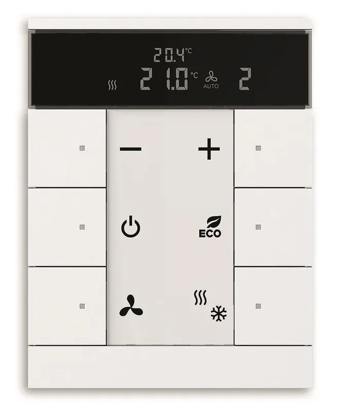 Fritt konfigurerbara multifunktions kontrollelement med RTC-slav funktion. Med integrerad KNX-busskopplare och med märknings fält. Stöd för KNX-funktioner genom innovativt färg koncept (gult = belysning, blått = blind, orange = RTC, magenta = scen och vit = neutral/ingen funktion tilldelad) eller standardbelysning röd/grön. Tempsensor.