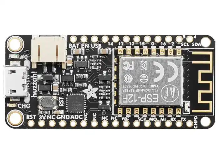 Adafuit Feather är ett minimalt utvecklingskort i flera skepnader. Just denna version har en ESP8266, kombinerad WiFi-modul / mikrokontroller från Tensilica. Kortet har inbyggd USB med auto-reset och batteriladdare för LiPo-batterier. Programmeras via Arduino IDE eller NodeMCU Lua.