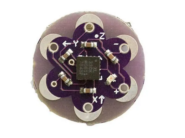 3-axels accelerometer i LilyPad-format. Accelerometern är uppbyggd kring en Analog Devices ADXL355 och kan känna av små vibrationer till yviga rörelser i alla riktningar. Kortet ger en analog utsignal för varje riktning, från 0V till 3V. Utgångarna kopplas till tre separata analoga ingångar på en mikrokontroller och med lite beräkning kan man få ut hastighet och riktning för rörelser.