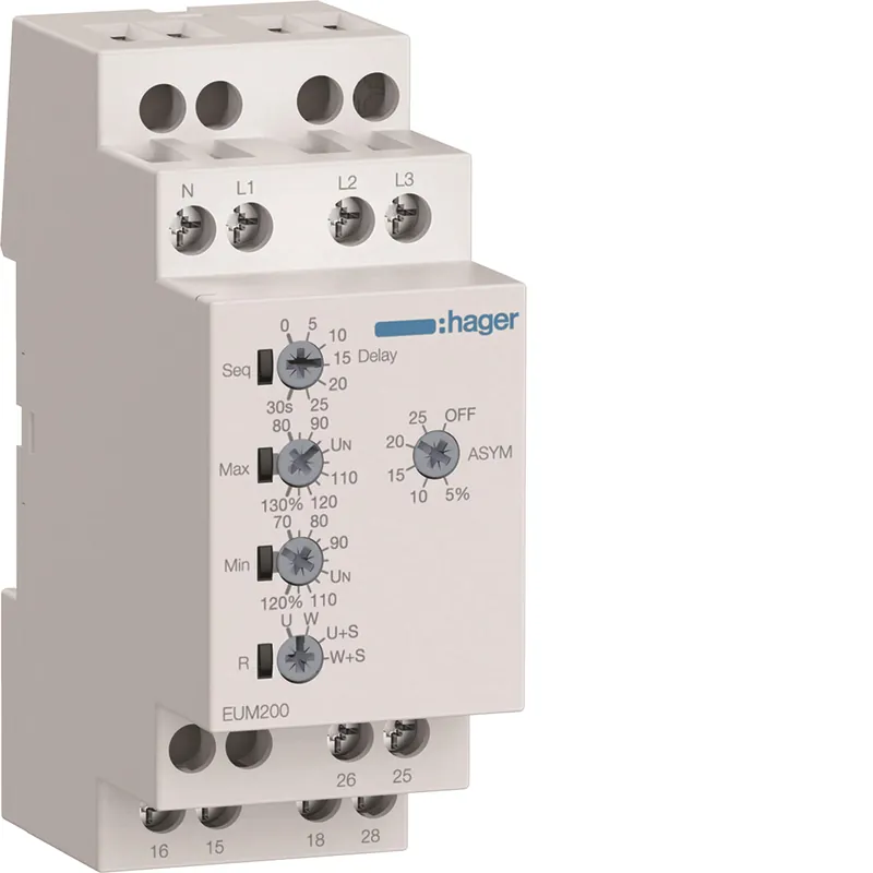 Hager spänningskontrollrelä övervakar spänningen i 1-fas och 3-fas AC-nät med inställbara tröskelvärden och en inställbar utlösningsfördröjning som kan ställas mellan 0 s och 30 s. Hager spänningskontrollrelä övervakar fasbortfall, fasföljd och asymmetri, och fasföljden kan justeras separat. Hager spänningskontrollrelä har fem potentiometrar för inställning av funktioner och tröskelvärden samt fyra kontrollampor som visar enhetens och installationens status. Hager spänningskontrollrelä stödjer underspänningsövervakning och hysteres i både 1-fas och 3-fas men har ingen funktion för överspänning eller likspänningsövervakning. Hager spänningskontrollrelä är avsett för mätning inom 161–520 V AC, ansluts med skruvanslutning och har två växlande kontakter med märkström 5 A vid 250 V. Hager spänningskontrollrelä har måtten 35 mm i bredd, 87 mm i höjd och 65 mm i djup.