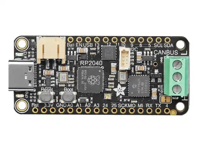 Adafruit RP2040 CAN Bus Feather är en ARM-baserad microkontroller för att komma igång med CAN Bus-kommunikation. På kortet finns CAN-chippet MCP25625, som har inbyggd transceiver och pratar SPI. MCP25625 har brett stöd, med bibliotek för bland annat Arduino och CircuitPython. Kretsen kan skicka data i vanligt eller utökat format med upp till 1 Mbps hastighet.