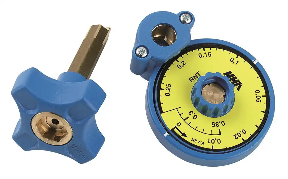 Förinställningsverktyg från MMA för att enkelt och smidigt ställa in Kv-värdet. Modell FV3 används för RNT-insats (gul) med inkluderad förinställningsnyckel.