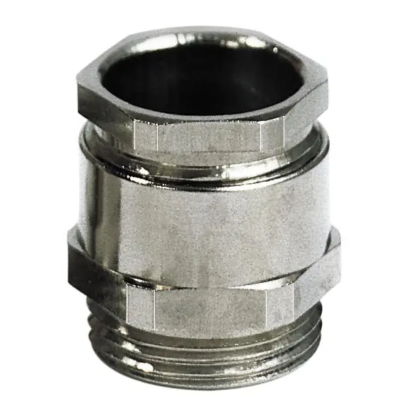 Kabelsförskruvning tillverkad av förnicklad mässing med metrisk gänga. Försedd med gängad sexkantig ytterhylsa enligt EN 50262, samt skivad neoprenpackning och två stycken brickor av galvaniserat stål. 1476070: Endast försedd med fast packning 4-8 mm.