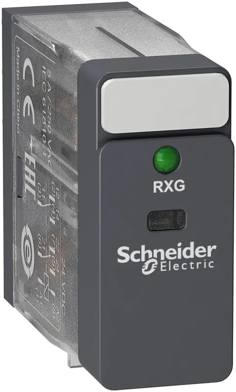 Interfacerelä med två växlande kontakter. IP40-klassificerad.