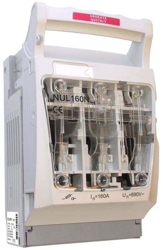 NUL160N knivsäkringshållare, storlek 00, av modell ”ugnslucka”. Klassad som säkringslastbrytare och följer frånskiljarkraven enligt SS-EN 60 974-3. Försedd med släckkammare som klarar brytning av strömmar upp till 80kA vid 690V AC. Avsedd för skruvmontage och monteras i bland annat insatser av typ NSLBxx.
