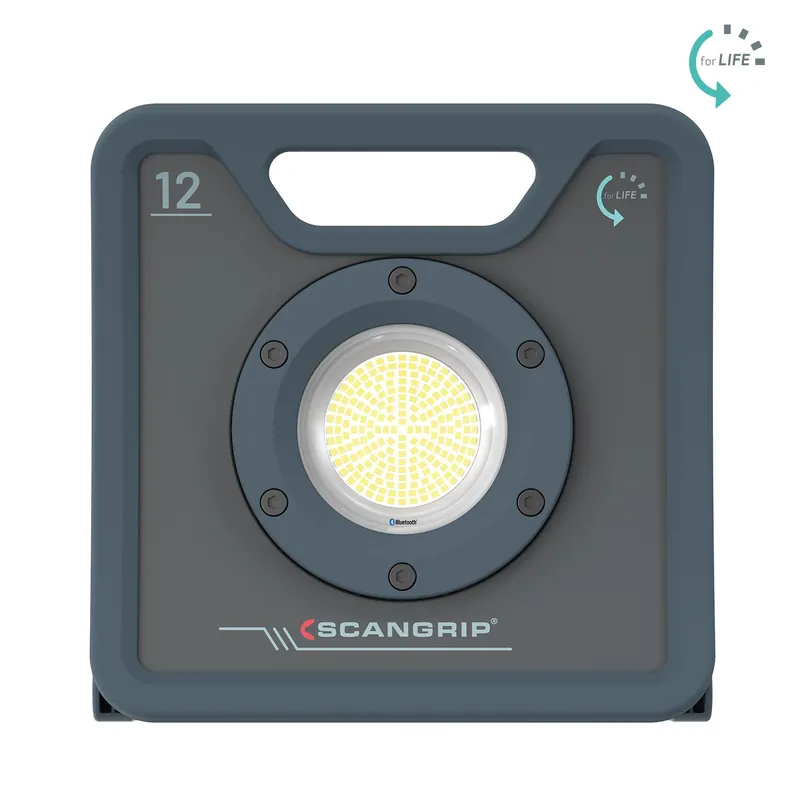 Scangrip LED-arbetslampa NOVA 12 drivs av en multi-LED-lösning med 200 lysdioder och erbjuder ett justerbart ljusflöde upp till 12 000 lumen. OPTILight-inställningen ger belysningsstyrka i lux för en typisk arbetssituation och kan aktiveras via knapptryckning, och ljusflödet är konstant samt mätt enligt den europeiska standarden EN 13032-1.