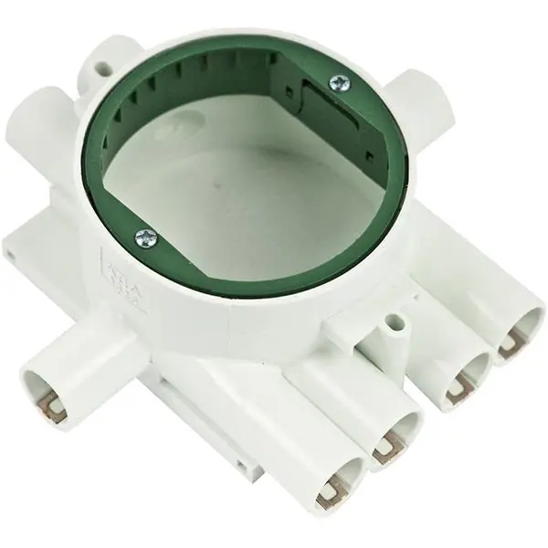Gelia A525 är en apparatdosa för anslutning av lamputtag och spisdosa. Dosan har 8 st Ø 16 mm anslutningar med låsfjäder.