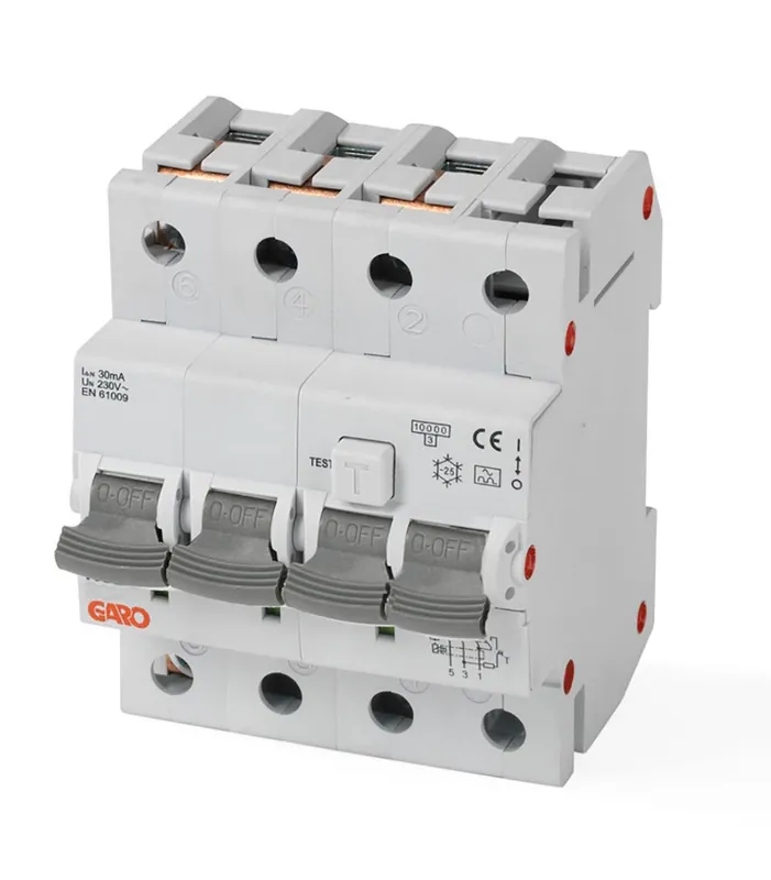 Personskyddsbrytare är en kombination av jordfelsbrytare och dvärgbrytare, dvs den skyddar både mot jordfel och överströmmar. Alla GARO personskyddsbrytare är testade och certifierade på oberoende Europeiskt testinstitut. Den 4-poliga är avsedd för 3-fas laster.