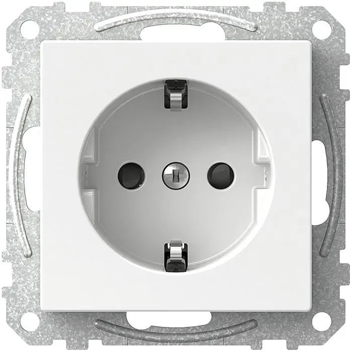 Schneider Exxact WDE002276 är ett jordat, 2-poligt, 1-vägs vägguttag med petskydd och skruvanslutning. För infälld montering i apparatdosa med c/c på 60 mm, alternativt utanpåliggande montage i dosa på 35 mm. Kompletteras med valfri Exxact-ram.