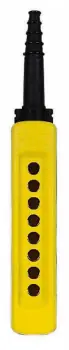 XACA08 är ett dubbelisolerat hängmanöverdon av slittåliggt polypropylen i klar gul färg för bra synlighet. Den har gummigenomföring med valbar kabelarea mellan 8-26 mm och 8 stycken håltagningar för att passa flera installationer.