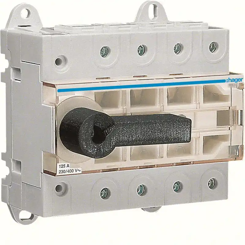 Lastbrytare med oberoende handmanövercoch synligt brytställe (125 A). Brytaren monteras på DIN-skena. Kan monteras i alla normkapslingar och skåp. Inkommande huvudledning kan anslutas direkt till brytarna. Inkoppling sker till beröringsskyddade anslutningar. Brytaren kan låsas i frånslaget läge för att kunna användas som frånskiljare vid arbete.
