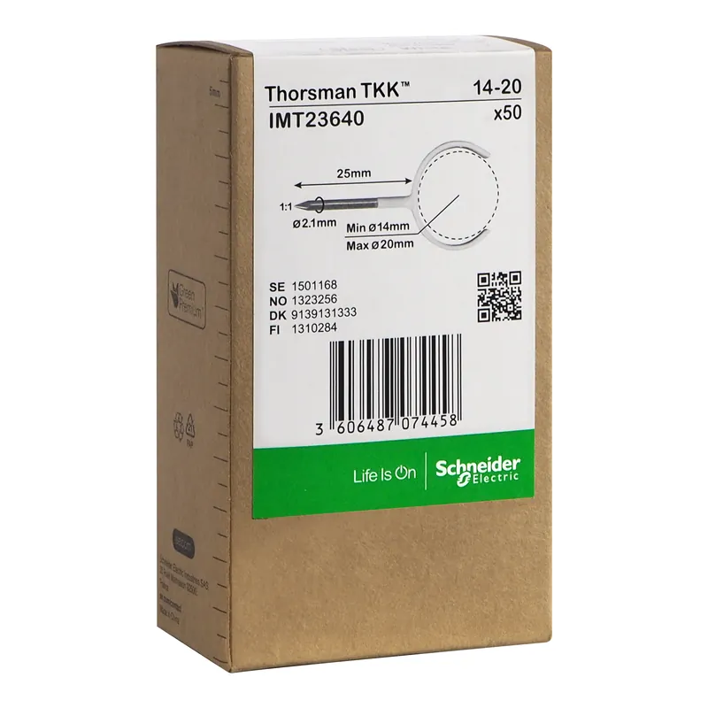 TKK pulverlackerade metallklämmor IMT23640 (50st/fp), längd 17 mm är avsedda för utanpåliggande installationer av elektriska kablar både inomhus och utomhus: rund kabel (14-20 mm diameter). Klämman levereras komplett med inbyggd elektropläterad stålspik, mått 2,1 x 25 mm. Pulverlackeringen ger mycket god motståndskraft mot korrosion och mekanisk påverkan, är klassad C4 och har god motståndskraft mot värme och solljus. Utmärkt där speciella estetiska krav ställs för kabeldragning tillsammans med övermålning, tapetsering, snickeri med mera. För enkel installation, använd universella monteringsverktyg som passar alla storlekar: TKK-Y, monteringsverktygssats, svart (ref. 2360009) eller TKK-N, monteringsverktygssats, blå (ref. 2360030) eller TKK-S, monteringsverktygssats, svart (ref. 2360018). Kan användas i trä, gipsskivor, betong och tegelväggar. Installationstips: För betong, lågdensitetsbetong, tegel och gipsskivor, använd tillsammans med Clipsplugg TCP.