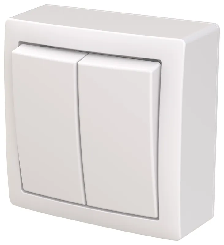 Kronströmbrytare för utanpåliggande montering med snabbplintar. Terminalerna är för max två solida eller stela ledningar. Inklusive brytarinsats, vippa, ytmonteringsram och botten. Biocirkulär plast används i botten- och mittplattan.