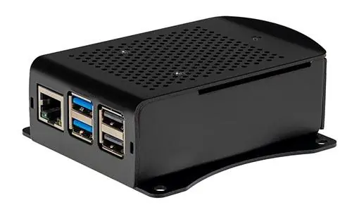 Låda för Raspberry Pi 5 med VESA-kompatibelt fäste som gör det möjligt att montera den på skärmar och TV-apparater med VESA 75×75-fäste. Observera att monteringsskruvar till VESA-fästet ej medföljer.