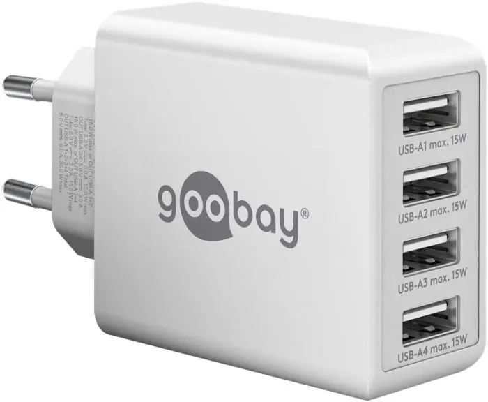 6A (30W) USB-laddare / strömförsörjning med 4x USB-A-port. Lämplig till mobiltelefoner, kameror, hörlurar, smartklockor, surfplattor, etc. Kompatibel med Apple, Samsung, LG, Huawei etc. Skyddar anslutna enheter mot överström, överladdning och överhettning. Mått: 94.1x51x27.3 mm.