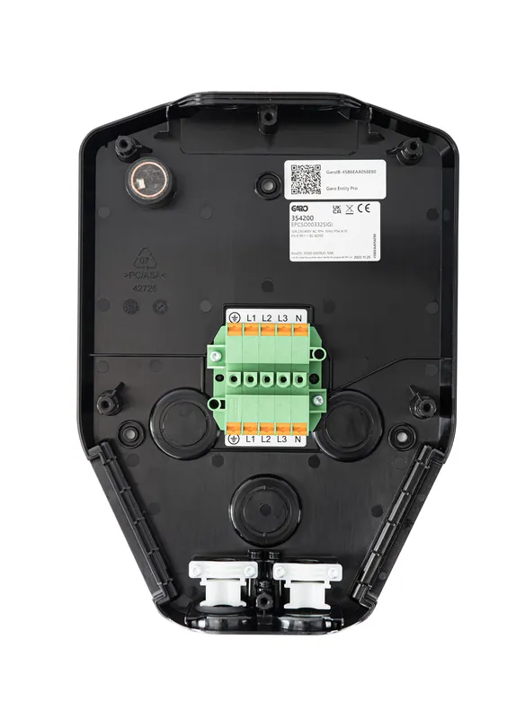 GARO installationskonsol är den del av en laddbox som fästs på väggen och till vilken matningskabel ansluts. Konsolen är försedd med en anslutningsplint för både koppar och aluminium och innehåller ett RFID-chip som utgör laddboxens identitet. Leverans omfattar endast installationskonsol och täcklock.
