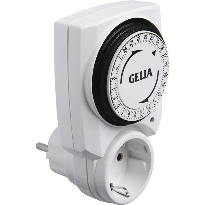 Gelia 06.0034021 är en jordad klockströmbrytare med 96 kopplingsmöjligheter och fasta inställningssegment.