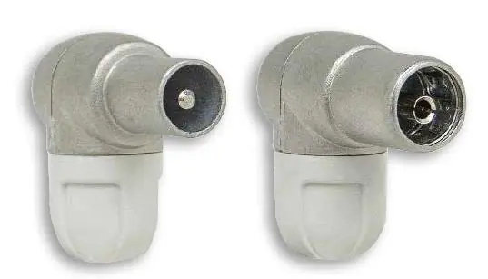 Televes 4130 är en vinklad koaxialkontakt IEC-hane, skärmad och med impedans på 75 ohm. Hög skärmning eliminerar störningar, kontakten kan återanvändas.
