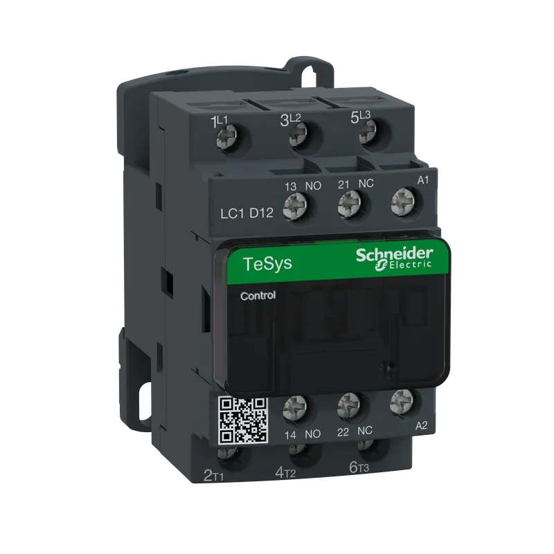 Växelströmsmanövrerande kontaktor TeSys D med spole. Ämnad för resistiv belastning och motorstyrning. 3-polig med 1 slutande och 1 brytande hjälpkontakt. Utan inbyggt störningsskydd.