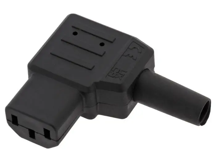 Vinklad apparatkontakt, typ C13. Passande nätbrunnar och kabel finns under tillbehör.
