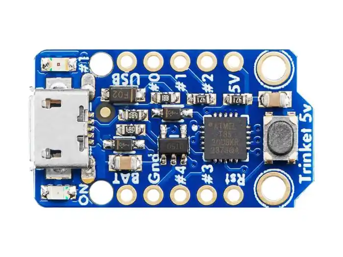Trinket är en minimal mikrokontroller från Adafruit. Den är baserad på en Atmel ATTiny85, en liten 8-pinnars mikroprocessor. Trots det lilla formatet är det en kraftfull processor med massor av funktionalitet, med 8k flash, 5GPIOs (analoga ingångar, PWM-utgångar). Trinket kommer förprogrammerad med en USB bootloader, vilket gör att man kan programmera den via USB. Med ett par små ändringar i Arduinos IDE kan man använda Trinket som en Arduino. Det lilla formatet gör dock att den inte är 100% Arduinokompatibel. T.ex. saknar den serieport för att debugga, vissa USB3.0-portar har problem att känna igen bootloadern och Linux stöds inte för närvarande, så för att programmera den, använd Windows eller MacOS.
