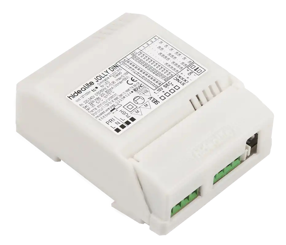 Hide-a-Lite Jolly Din är en konverter som med en enkel inställning klarar av att driva och ljusreglera de flesta typer av LED-ljuskällor för konstantström DC (200 mA till 800 mA i steg om 50 mA). 1-10 st enheter kan länkas och styras från ett eller flera ställen via återfjädrande tryckknapp, via potentiometer, 1-10V eller bus-/KNX-system via aktor. För LED med inbyggd PWM-dimmer för enkel installation direkt på DIN-skena vid stora projekt och små renoveringar.