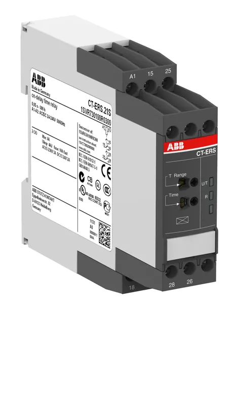 ABB tillslagsfördröjt tidrelä är avsett för montage på DIN-skena och har manöver- och driftspänning AC/DC 24–240 V vid 50/60 Hz samt 24–48 V vid DC. Tidsområdet är 0,05–1 080 000 s (0,05 s–300 h) och fördröjning sker vid magnetisering, vilket innebär att reläet aktiverar utgångarna efter inställd tid. Enheten har två växlande fördröjda utgångar och två växlande ofördröjda utgångar med märkström 4 A och skruvanslutning för elanslutning. Kapslingsklass IP20 gäller, enheten är inte avsedd för frontmontering och levereras inte komplett med uttag. Dimensionerna är 22,5 mm i bredd, 85,6 mm i höjd och 103,7 mm i djup.