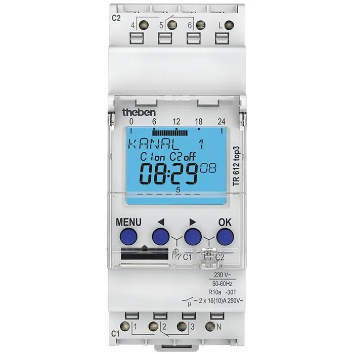 Kopplingsur TR 612 Top3 har 56 stycken minnesplatser samt nollpunktsbrytning för relä-skonande koppling och hög lamplast (inte på 24 V enheter). Ger maximalt skydd mot manipulation då tidskopplingsprogram endast kan överföras från appen till klockan om Bluetooth OBELISK Top3 är kopplad. TR 612 Top 3 är även 100% kompatibel med Top2-serien. Omställningsregler för olika länder är redan lagrade i uret, men egna omställningsregler eller omväxling kan väljas efter fixerat datum.