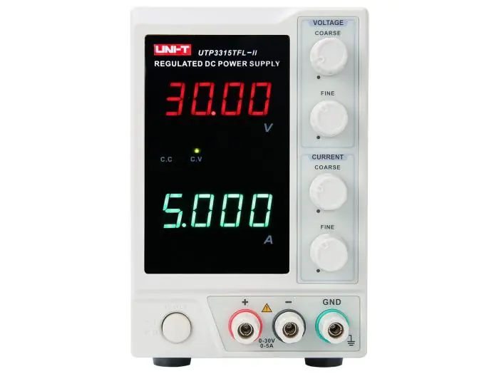 150W labbaggregat med grov och finjustering för både ström och spänning. Drift med konstant spänning (CV) och konstant ström (CC). Levereras med strömkabel CEE 7/7 och manual.