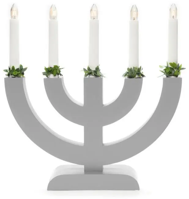 Konstsmide 3988-319 är en är en elljusstake med 5 ljuspunkter, av trä i grå med gröna dekorationer, 230V/IP20.