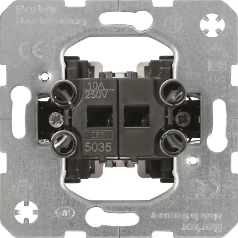 Tryckknappsinsats, återfjädrande 10A med snabbanslutningar och klor där inget annat anges. För infällt IP20 montage i apparatdosa C/C 60 eller utvändigt montage i förhöjningsram. Kompletteras med ramar och vippor från samtliga av Berkers serier förutom 1930.