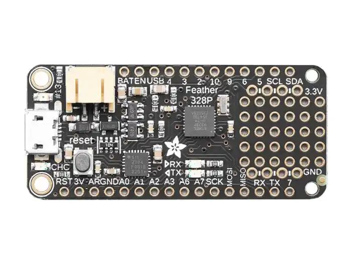 Nu finns det klassiska ”Arduino-chipet” Atmega 328p i Adafruit Feather-utförande! Det välbekanta chipet och integrationen med Arduinos IDE, tillsammans med de många FeatherWing-korten är en kombination som gör det snabbt och lätt att skapa kompakta och lätta byggen med en mängd olika funktioner. Liksom andra versioner av Feather har det en inbyggd LiPo-laddare och batterikontakt, medföljande (men omonterade) stiftlister för maximal flexibilitet i konstruktionen.